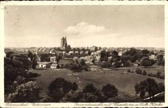 Ak Blumenthal an der Weser Hansestadt Bremen, Gesamtansicht, Wasserturm, Luth. Kirche