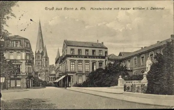 Ak Bonn am Rhein, Münsterkirche mit Kaiser Wilhelm I. Denkmal