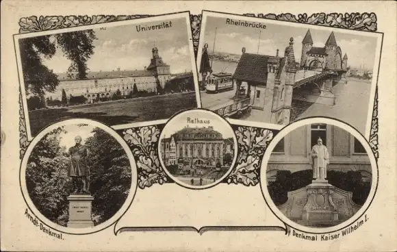 Ak Bonn am Rhein, Rathaus, Universität, Rheinbrücke, Arndt-Denkmal, Denkmal Kaiser Wilhelm I.