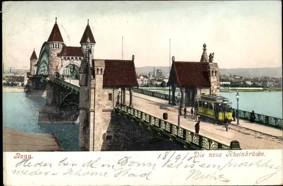 Ak Bonn am Rhein, neue Rheinbrücke, Straßenbahn