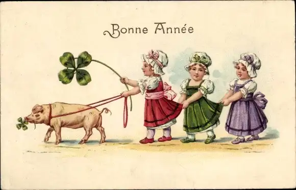 Ak Bonne Année, Glückwunsch Neujahr, Schwein, Kleeblatt, Mädchen