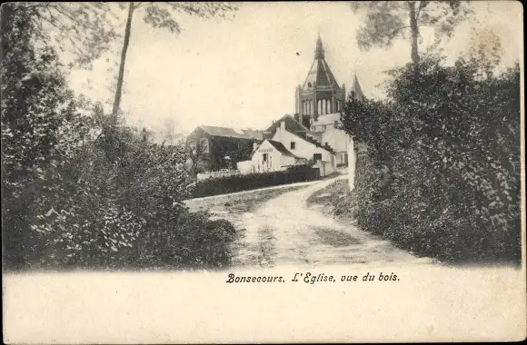 Ak Bonsecours Seine Maritime, L'Eglise, vue du bois