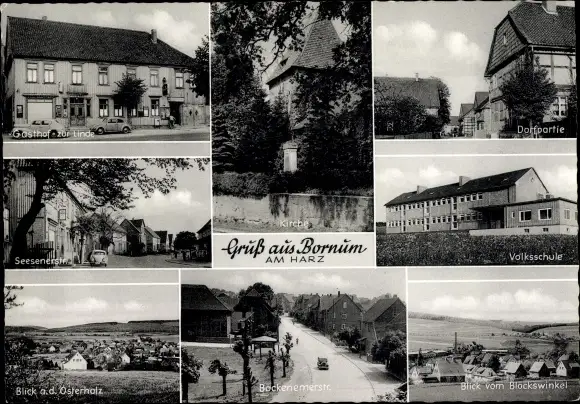 Ak Bornum Bockenem am Harz, Kirche, Gasthof zur Linde, Volksschule, Straßenansichten
