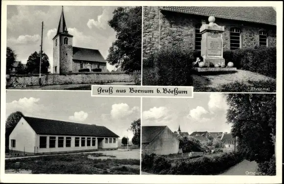 Ak Bornum Börßum am Harz, Kirche, Ehrenmal, Schule, Ortspartie