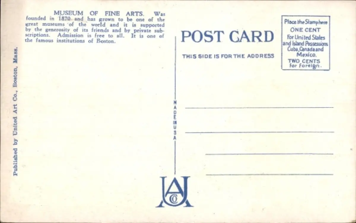 Ak Boston Massachusetts USA, Museum of Fine Arts, Statue im Innenhof, Autos sichtbar