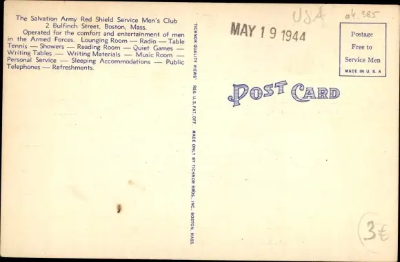 Ak Boston Massachusetts USA, Red Shield Service Men's Club, Game Room, Snack Bar