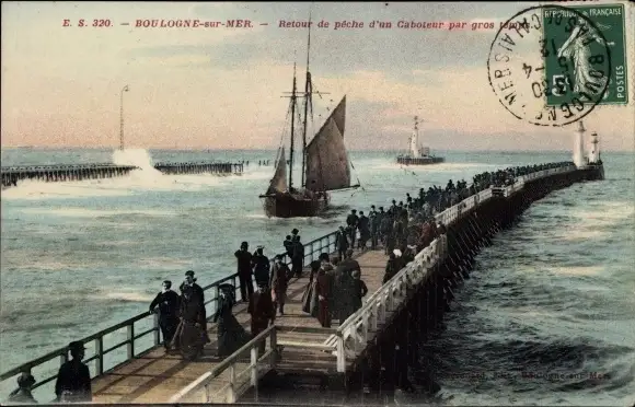 Ak Boulogne sur Mer Pas de Calais, Retour de pêche d'un Gaboteur, Seebrücke, stürmische See