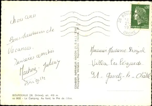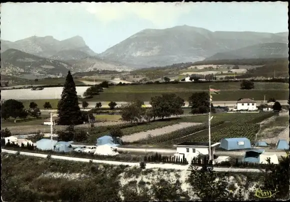 Ak Bourdeaux Drome, Le Camping, Au fond, le Pre de l'Ane