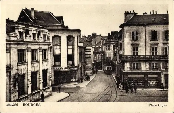 Ak Bourges Cher, Place Cujas, Geschäfte, Straßenbahn