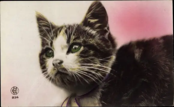 Ak Braun-weiße Katze, Tierportrait