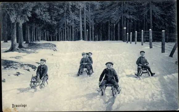 Ak Braunlage im Oberharz, Rodelbahn, Kinder auf Schlitten