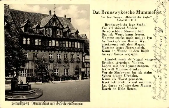 Ak Braunschweig in Niedersachsen, Mummelhaus, Eulenspiegelbrunnen, Gedicht