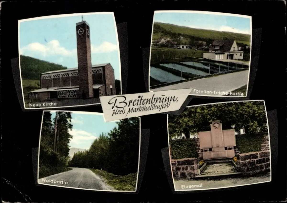 Ak Breitenbrunn Faulbach in Unterfranken, Neue Kirche, Forellen-Teiche, Wald, Ehrenmal