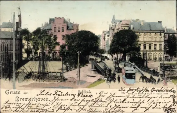 Ak Bremerhaven, Geestebrücke, Straßenbahn