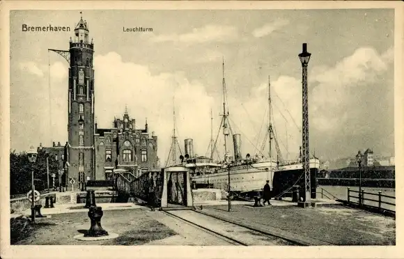 Ak Bremerhaven, Leuchtturm, Dampfschiffe, Ankerpoller