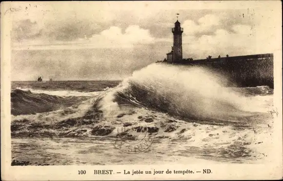 Ak Brest Finistère, La jetee un jour de tempete, Leuchtturm