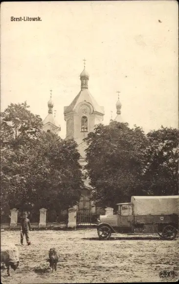 Ak Brest Litowsk Weißrussland, LKW, Kirche, Widder