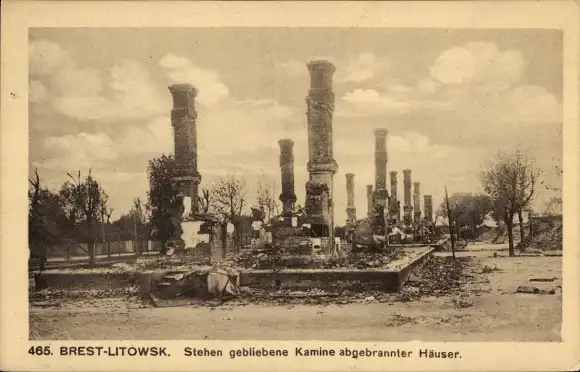 Ak Brest Litowsk Weißrussland, Stehengebliebene Kamine abgebrannter Häuser