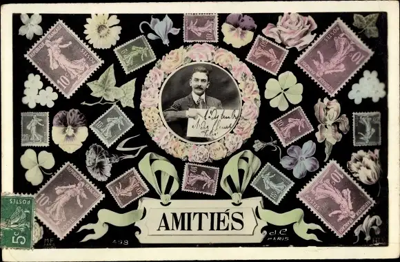 Ak Briefmarkensprache, Blumen, Kleeblatt, Männerportrait