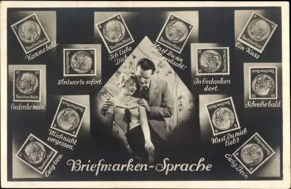 Ak Briefmarkensprache, Komme bald, ich liebe dich, ein Kuss, Liebespaar