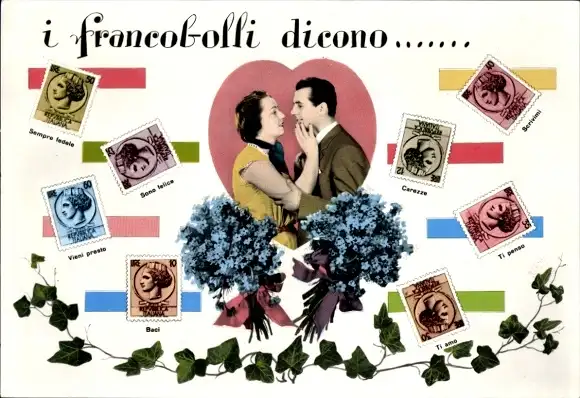Ak Briefmarkensprache, Liebespaar, Blumen