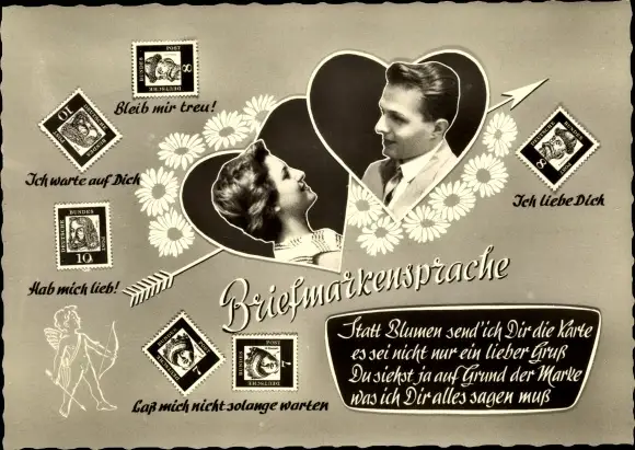 Ak Briefmarkensprache, Liebespaar, Hab mich lieb, Bleib mir treu, Ich liebe Dich