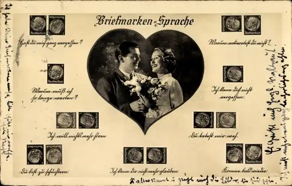 Ak Briefmarkensprache, Liebespaar, Kitsch