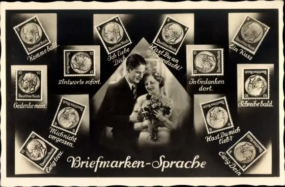 Ak Briefmarkensprache, Liebespaar, Komme bald, Ich liebe Dich