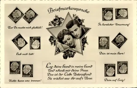 Ak Briefmarkensprache, Liebespaar, Kuss, Hab mich lieb