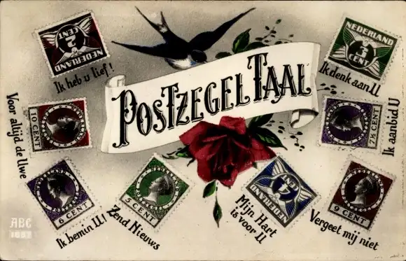Ak Briefmarkensprache, Schwalbe, Rote Rose