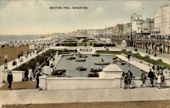 Ak Brighton East Sussex England, Boating Pool, Menschen, Boote, Strandpromenade, Architektur
