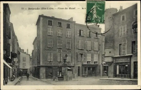 Ak Brioude Haute Loire, Place du Mazel, Charcuterie du Centre, Café du Commerce