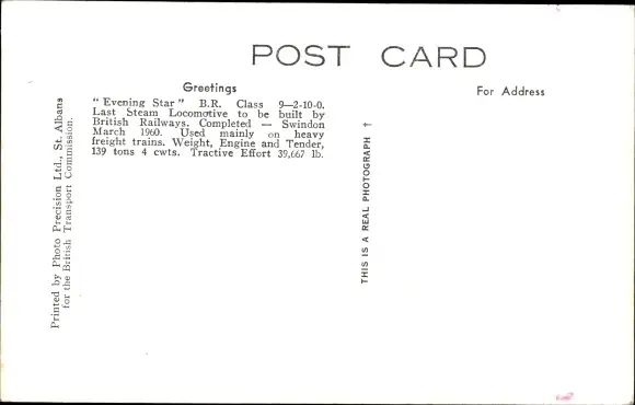 Ak Britische Eisenbahn, Evening Star, Dampflok, Tender 92220