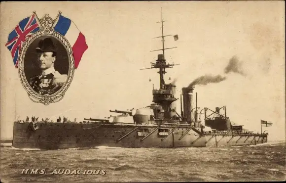 Ak Britisches Kriegsschiff, HMS Audacious, Flaggen