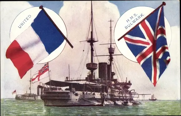 Ak Britisches Kriegsschiff, HMS Bulwark, United, Flaggen