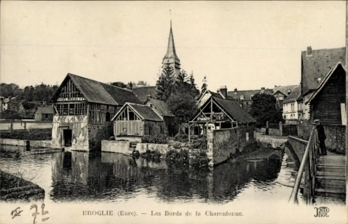 Ak Broglie Eure, Kirchturm, Häuser, Flusspartie
