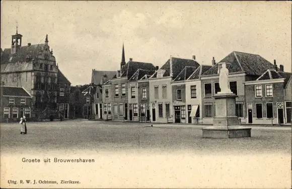 Ak Brouwershaven Zeeland, Stadtansicht, Platz, Denkmal