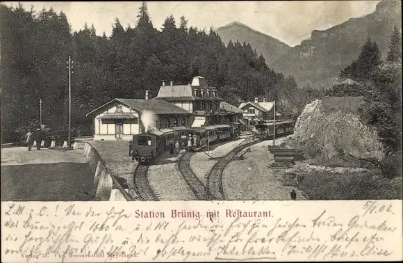 Ak Brünig Meiringen Kt. Bern Schweiz, Bahnhof Brünig mit Restaurant