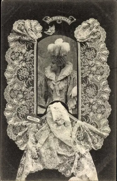 Ak Brüssler Spitze, Geklöppeltes Spitzentuch, Frau in historischem Kleid