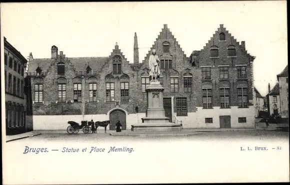 Ak Bruges Brügge Flandern Westflandern, Statue et Place Memling