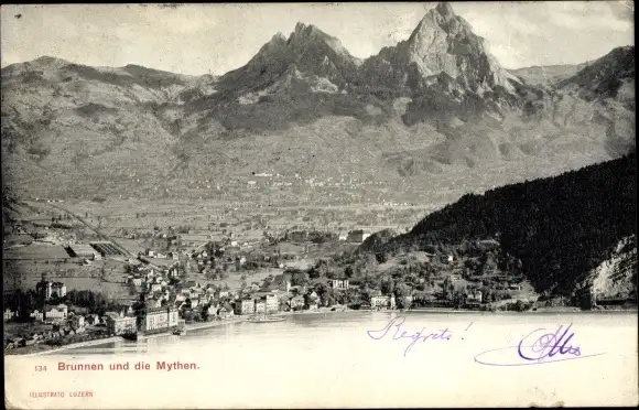 Ak Brunnen Kt Schwyz, Gesamtansicht, Mythen