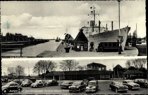Ak Brunsbüttel in Dithmarschen, Fähre am Anleger, Aufgang an den Schleusen Gustav Meyer Platz
