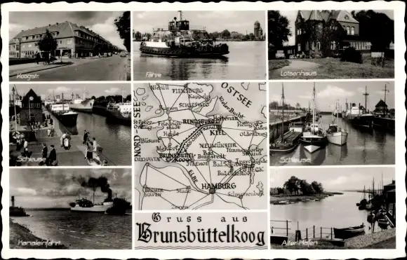 Ak Brunsbüttelkoog Brunsbüttel in Dithmarschen, Landkarte, Fähre, Lotsenhaus, Schleuse, Kanalfahrt