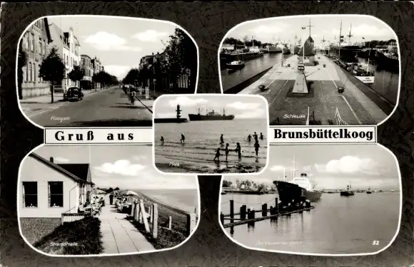 Ak Brunsbüttelkoog Brunsbüttel in Dithmarschen, Moogstraße, Schleuse, Anleger mit Schiff
