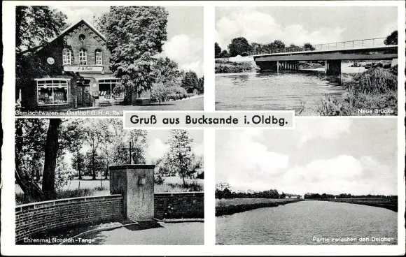 Ak Bucksande Apen in Oldenburg Ammerland, Gasthof, Neue Brücke, Ehrenmal