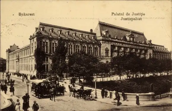 Ak București Bukarest Rumänien, Justizpalast, Pferdebahn