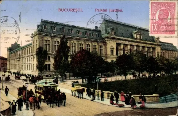 Ak București Bukarest Rumänien, Palatul Justitiei, Pferdebahn