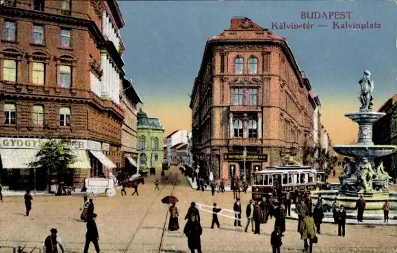 Ak Budapest in Ungarn, Kalvin Ter, Kalvinplatz, Straßenbahn und der Stadtbrunnen
