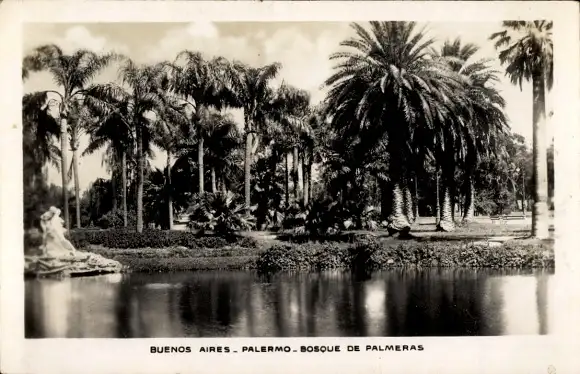 Ak Buenos Aires Argentinien, Parkanlage mit Palmen, Wasserfläche, Statue