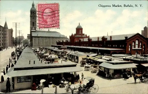 Ak Buffalo New York USA, Chippewa Markt, Marktstände, Architektur, Poststempel